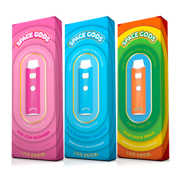 The all new Space Gods Live Rosin disposables. Live Rosin is similar to Live Resin; but is more time consuming and involves more labor. Live Rosin is processed at a lower temperature to preserve the cannabinoids and terpenes. Each Space Gods disposable contains a blend of Delta-8 + delta-9 Live Rosin. Space brings 3 exotic strains to choose from. Each Space Gods disposable is derived from 100% USA grown hemp and are federally legal under the 2018 Farm Bill Act.